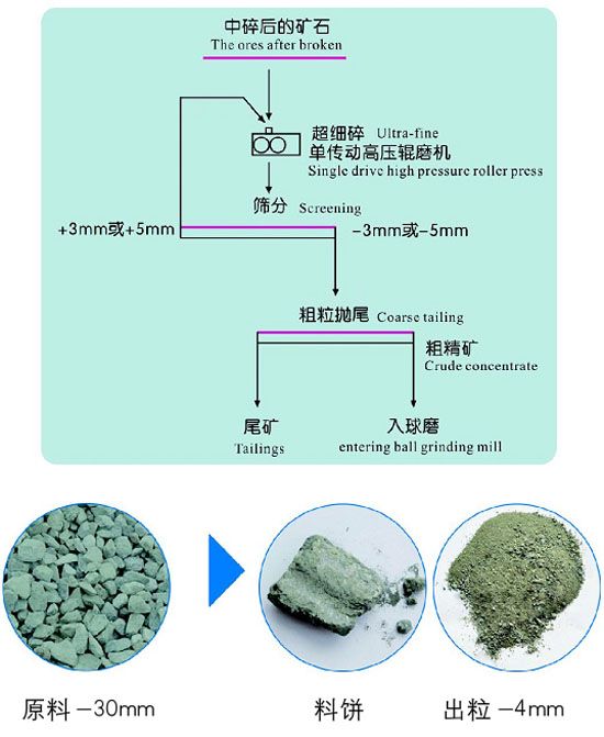 由于高壓輥磨機(jī)出料細(xì)粉含量高.并且多沿解理面破碎,同時具備這兩大優(yōu)勢.與常規(guī)破碎相比.破碎產(chǎn)品連生體比例降低.其拋尾效果好.粗精礦品位和拋度產(chǎn)率均大幅提高。